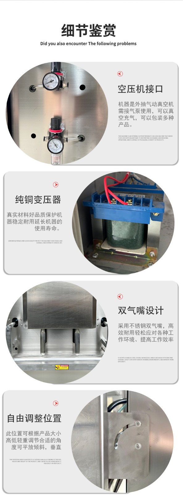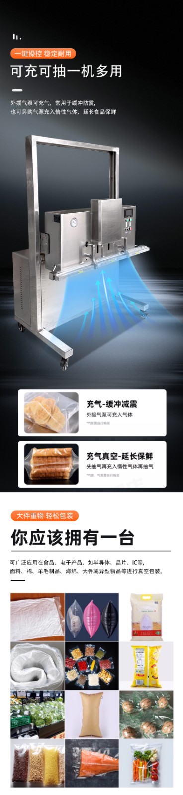 • 真空與充氣一體:多數立式升降真空包裝機兼具真空和充氣功能,抽完真空后,可往包裝袋內充入氮氣、二氧化碳等惰性氣體,適合食品保鮮等。
