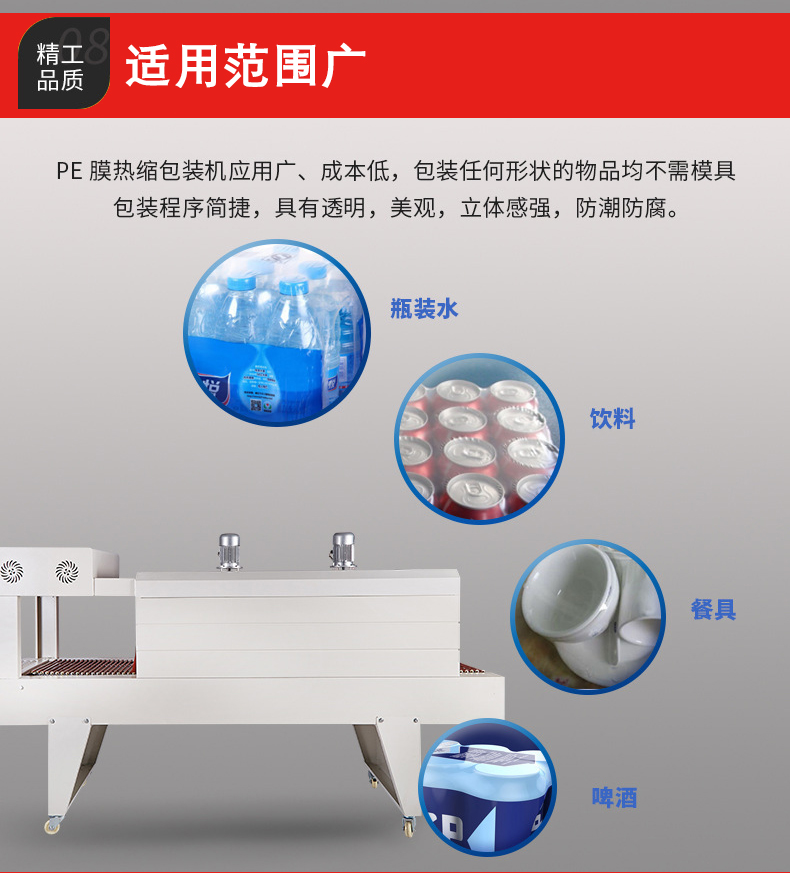 - 適用范圍廣:可以用于包裝各種形狀和尺寸的產(chǎn)品,無(wú)論是規(guī)則的圓柱體、長(zhǎng)方體,還是不規(guī)則的產(chǎn)品,只要選擇合適的 PE 薄膜,都可以用這種機(jī)器進(jìn)行包裝。而且它可以與其他包裝設(shè)備和生產(chǎn)線集成,實(shí)現(xiàn)自動(dòng)化包裝,提高生產(chǎn)效率。