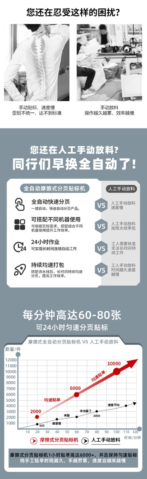- 高速貼標:全自動分頁貼標機采用先進的機械結構和控制系統,具備極高的貼標速度。一般來說,其貼標速度可達每分鐘 100-300 張甚至更高,具體速度取決于設備的型號和配置。相比之下,人工貼標速度慢,且難以長時間保持穩定的高效率,全自動分頁貼標機可以持續穩定地高速運行,大大縮短了產品的貼標時間,提高了整體生產效率。