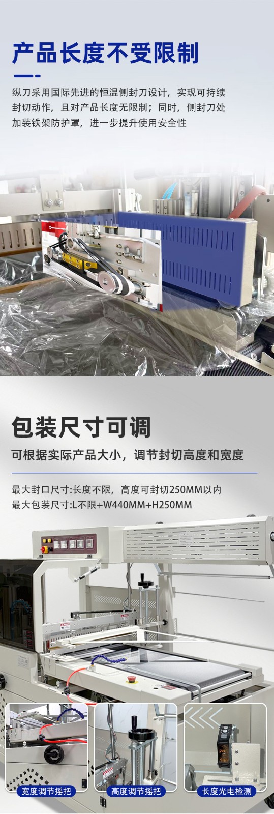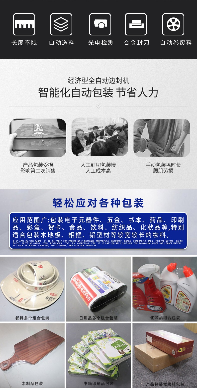 • 適用范圍廣4:邊封設計的包裝機可包裝長度不限的產品,通過調整還能適應不同寬度、高度的產品包裝,可用于 POF、PVC 等多種熱收縮膜,能滿足食品、電子、醫藥、日化等多個行業的包裝需求。