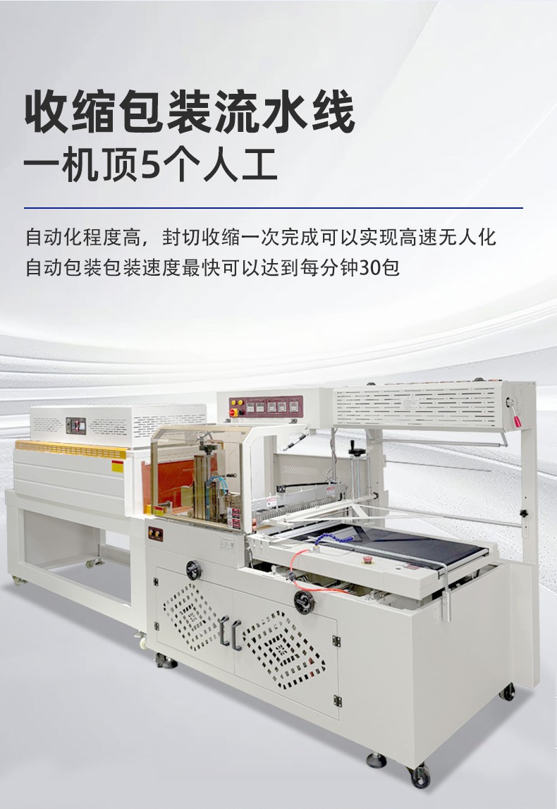 • 工作原理6:通常基于恒溫加熱技術,先將收縮膜加熱至所需溫度,然后對已包裹產品的收縮膜進行熱封切操作,再將完成封切的產品送入收縮爐內加熱,使收縮膜收縮并緊密貼合產品,最后經冷卻得到平整美觀的包裝效果。