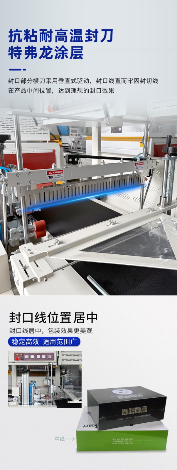 • 封切效果好5:封切刀通常采用杜邦特弗龍涂層抗粘耐高溫鋁合金刀,封口牢固,不會開裂、焦化,且封口線直而美觀。部分設備還具備封切刀保護裝置,可防止誤切包裝物。