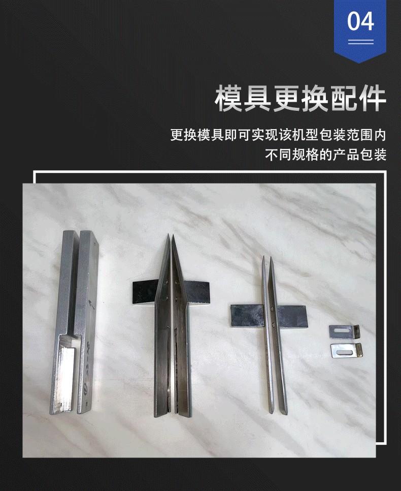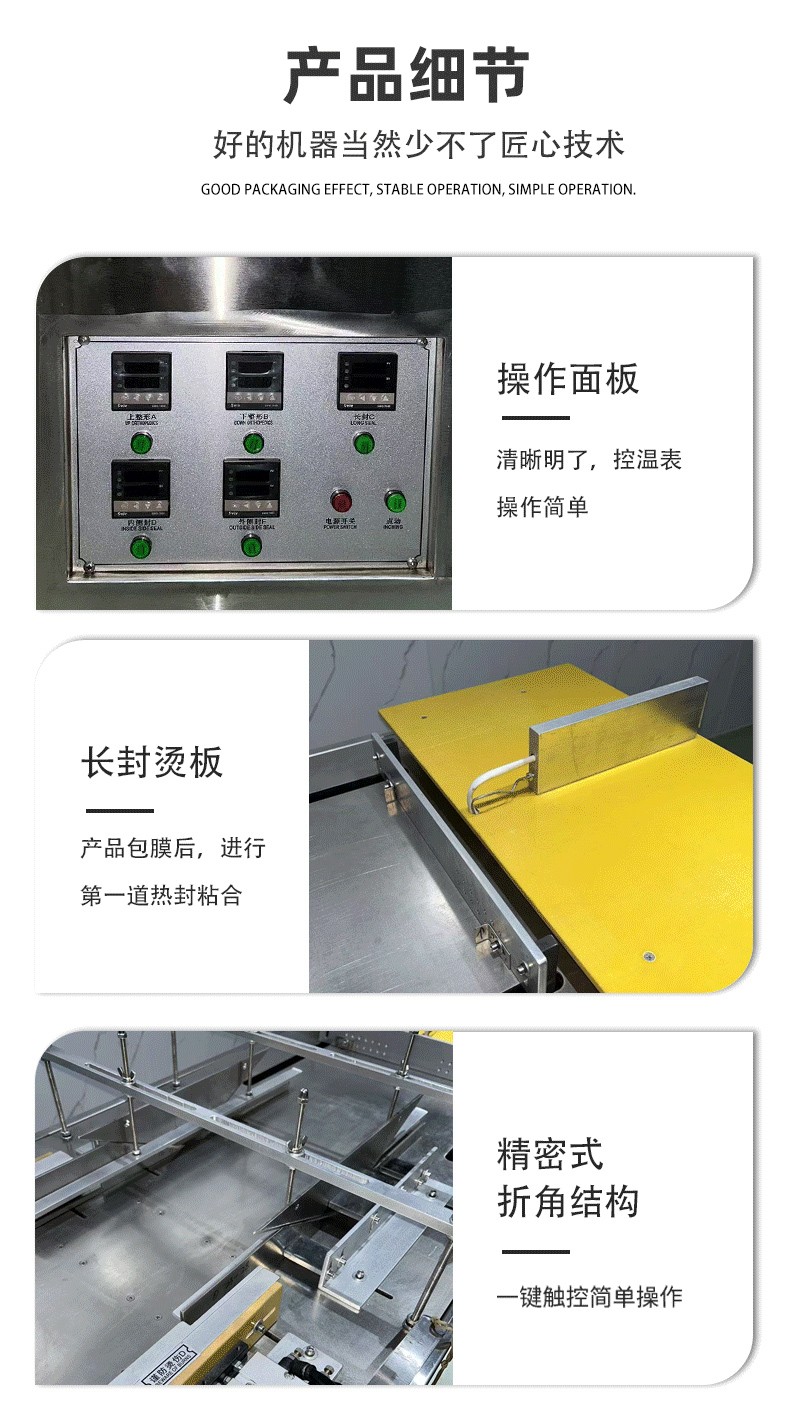 5. 折邊定型:封切后的產品進入折邊工位,預熱裝置先對產品兩端的多余膜料進行軟化(便于塑形),再通過機械折邊機構(側折板、端折板)將膜料折疊、壓合,使包裝邊緣平整緊致,最終形成與產品形狀完全匹配的立體包裝;