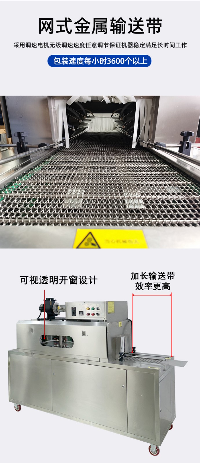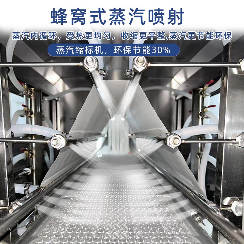 配備 PLC 智能控制系統,可精準調節蒸汽溫度(50℃-120℃可調)、輸送速度與蒸汽噴射量,兼容 POF、PVC、PE 等多種熱收縮膜材,滿足不同產品的包裝厚度與質感要求。